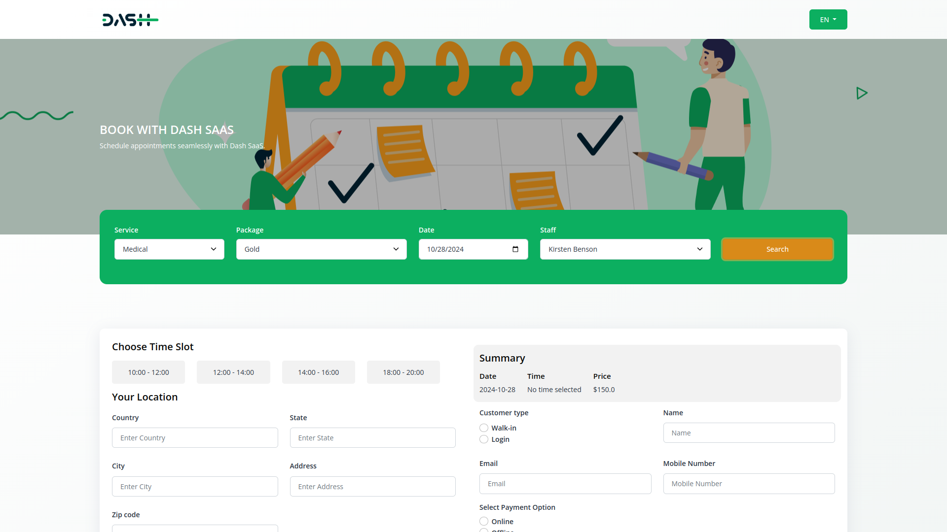 Streamline your scheduling with Dash SaaS Booking. Integrated seamlessly into the Dash Saas platform, our intuitive module minimizes conflicts and enhances customer satisfaction. Simplify appointments effortlessly.