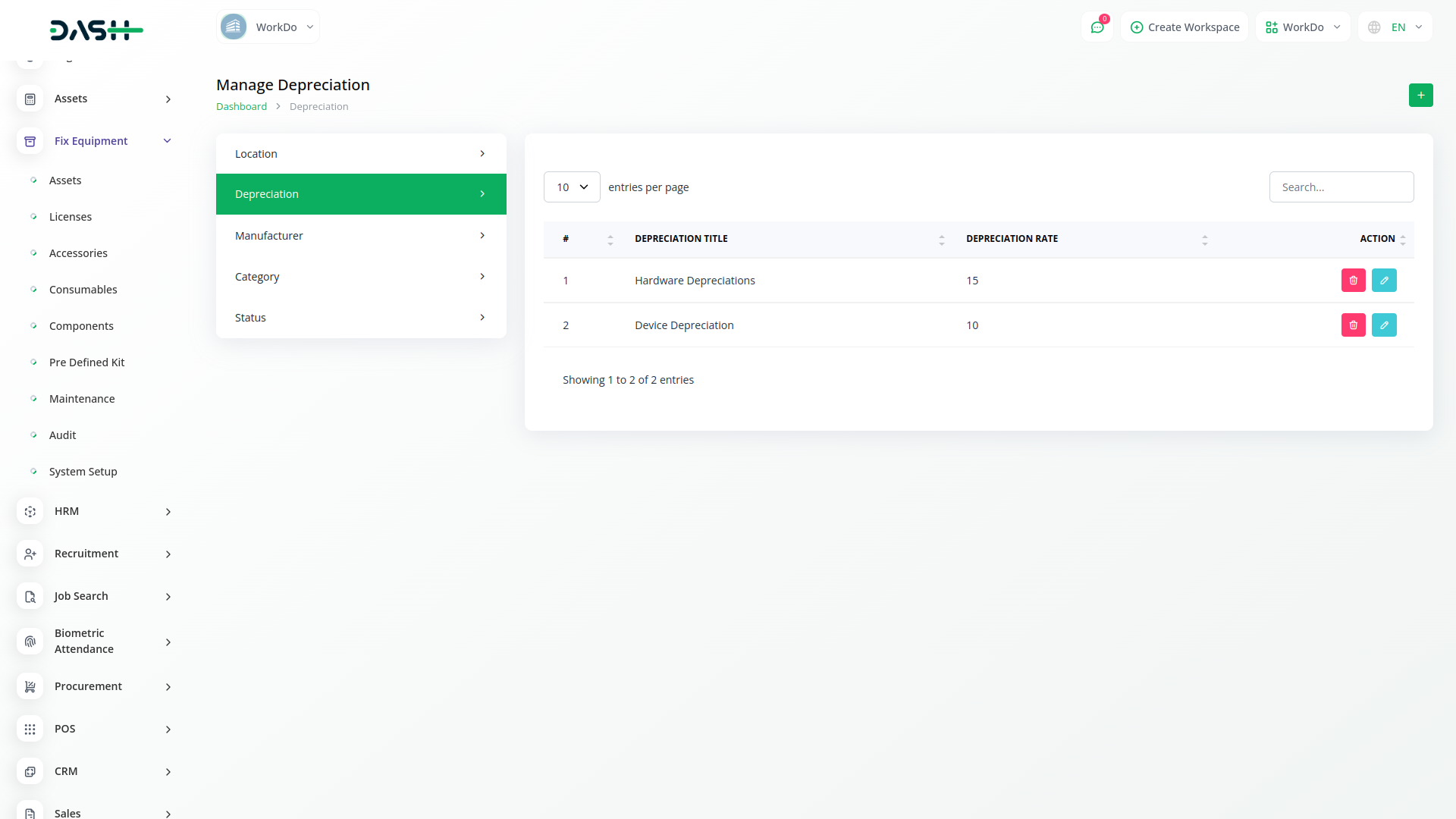 Establish module for managing equipment, facilities, vehicles and other assets based on industry standards. Keep track of individual assets and schedule, assign and record maintenance work.