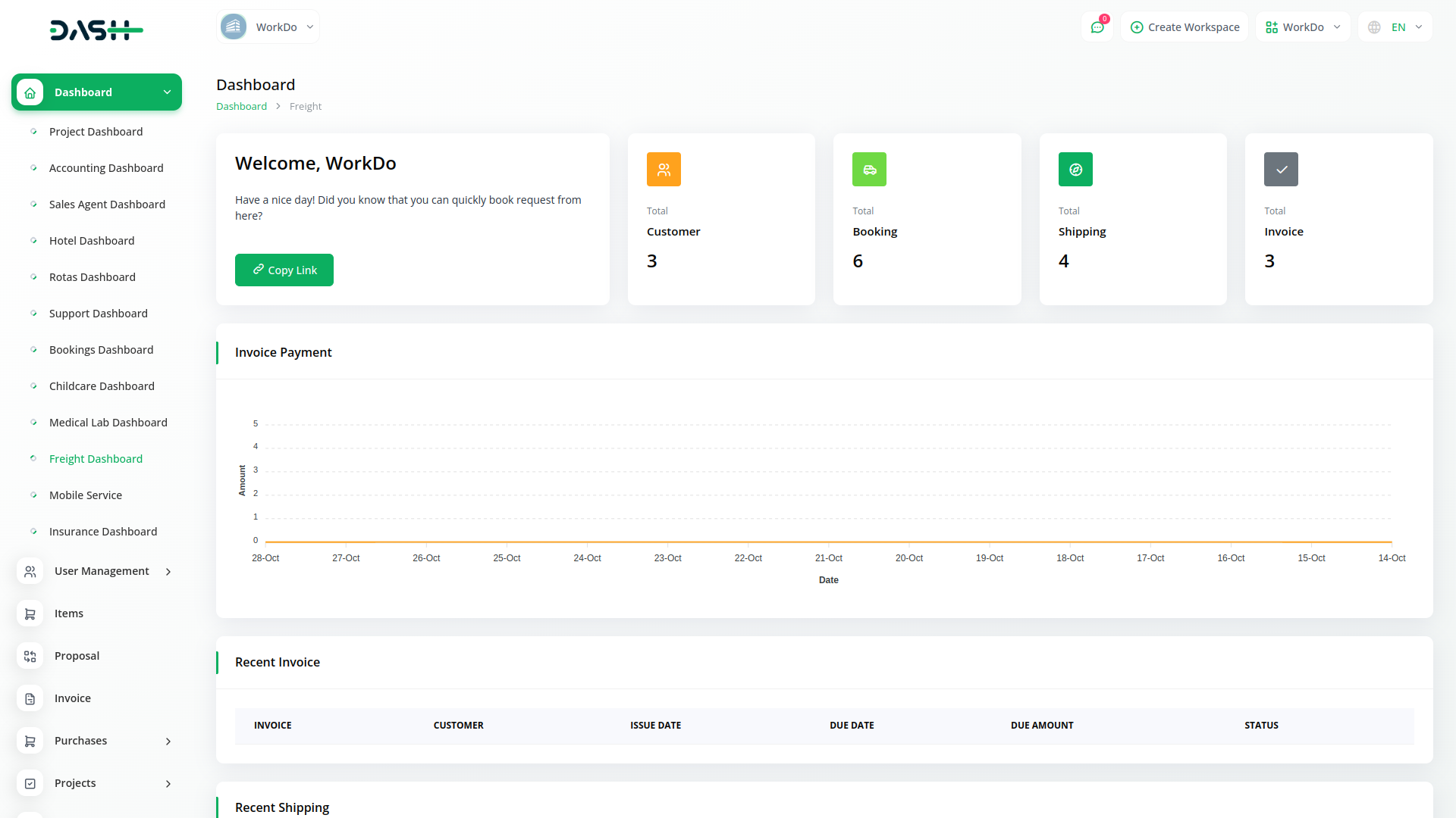 Gain unparalleled insights into your logistics operations with the comprehensive dashboard provided by Dash SaaS Freight Management Integration. This intuitive dashboard serves as your command center, presenting key metrics such as total customers, bookings, shipping, and invoices in a visually engaging and easy-to-understand format. Moreover, you can effortlessly monitor recent invoices and shipping lists, ensuring that you have real-time visibility into the performance of your logistics processes and the status of your shipments.