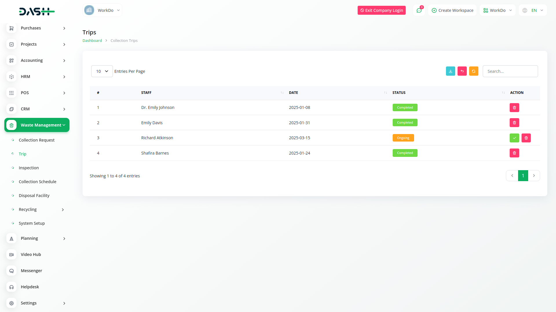 Visualize data trends with charts depicting collection request statuses, trip progress, and inspection outcomes, Analyze waste management metrics to identify areas for improvement and optimization.